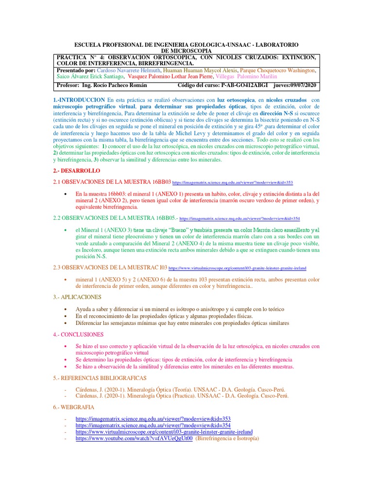 PRÁCTICA N° 4: OBSERVACIÓN ORTOSCOPICA, CON NICOLES CRUZADOS: EXTINCION,