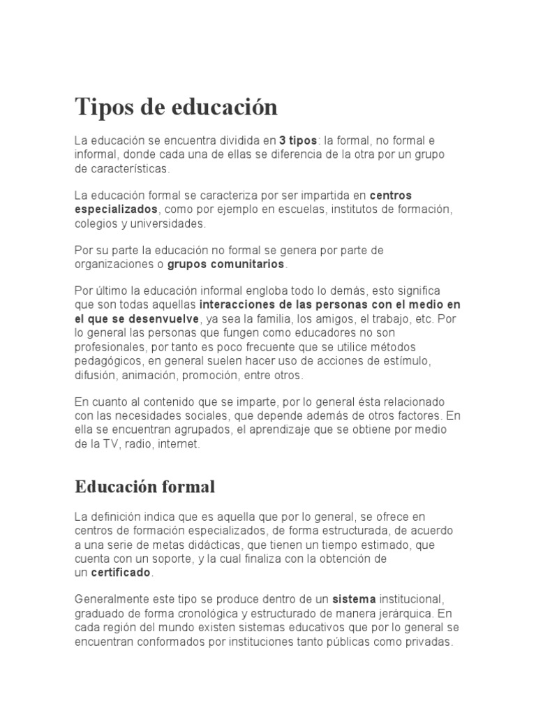 La educación se encuentra dividida en 3 tipos: la formal, no formal e