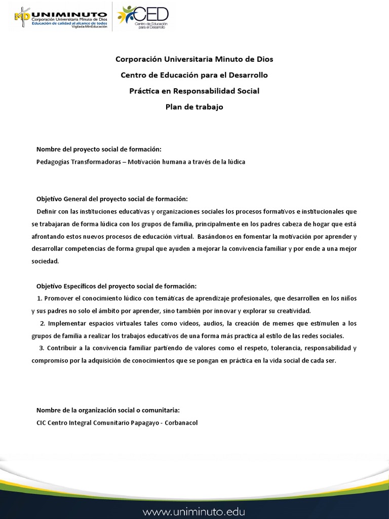 En el plan de trabajo el grupo de estudiantes debe incluir herramientas participativas y creativas en las