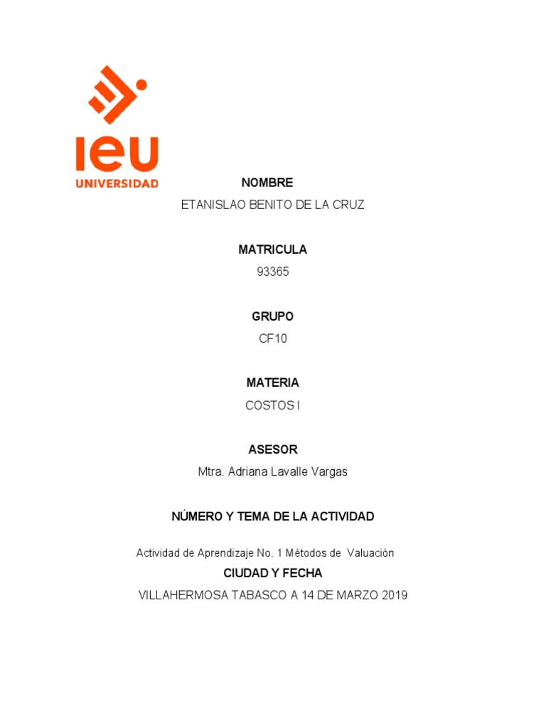 Actividad de Aprendizaje No. 1 Métodos de Valuación
