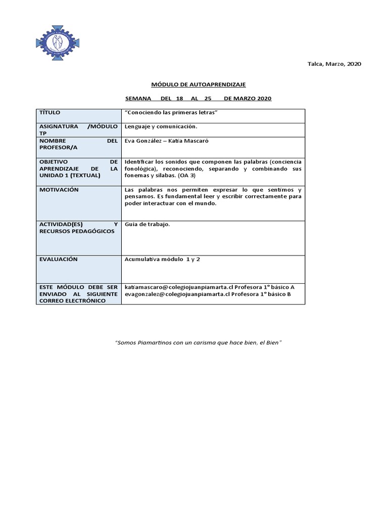 ESTE MÓDULO DEBE SER katiamascaro@colegiojuanpiamarta.cl Profesora 1° básico A