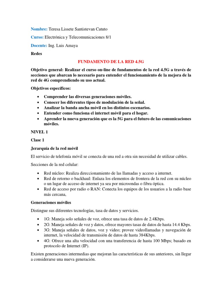 Objetivo general: Realizar el curso on-line de fundamentos de la red 4.5G a través de