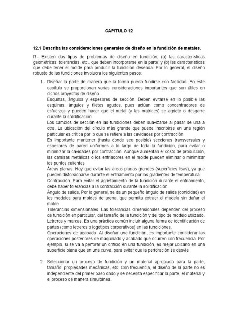 12.1 Describa las consideraciones generales de diseño en la fundición de metales.