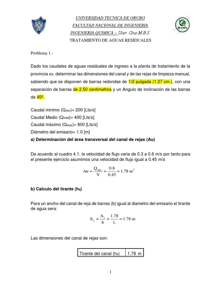 Para un ancho del canal de reja de barras (b) igual al diametro del emisario el tirante