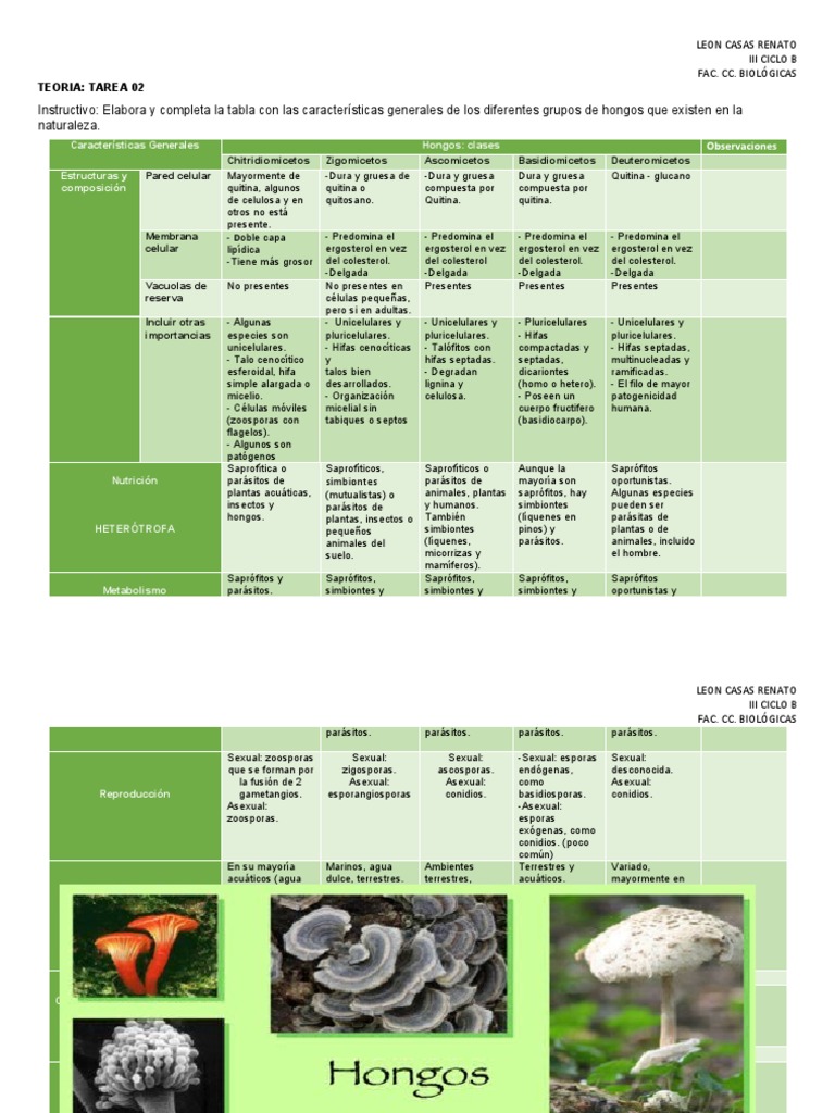 Instructivo: Elabora y completa la tabla con las características generales de los diferentes grupos de hongos que existen en la