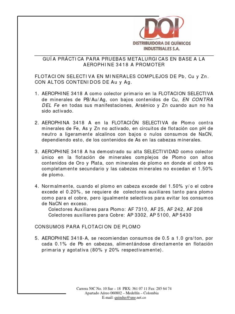 5. AEROPHINE 3418-A, se recomiendan consumos de 0.5 a 1.0 grs/ton, por