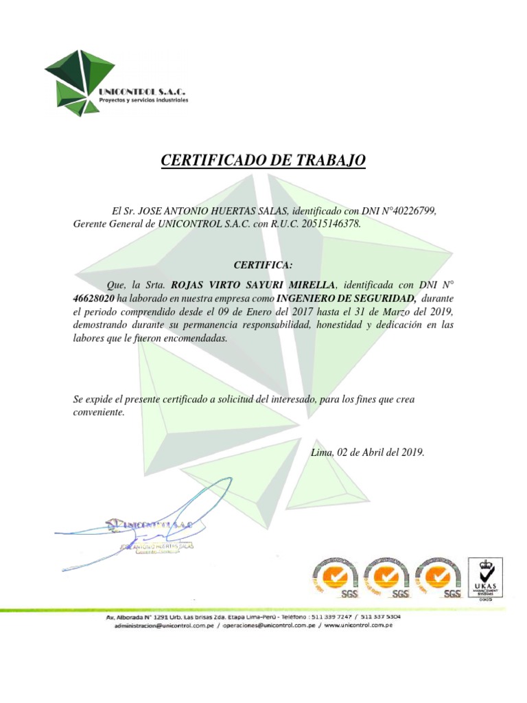 Gerente General de UNICONTROL S.A.C. con R.U.C. 20515146378.