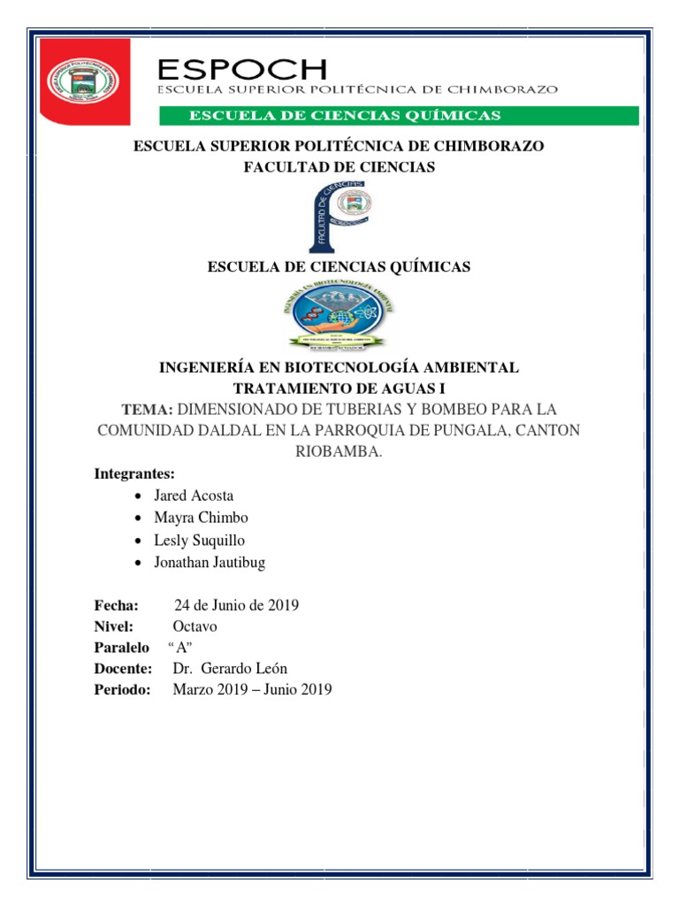 Tema: Dimensionado de tuberías y bombeo para la comunidad Daldal en la parroquia de Pungalá,