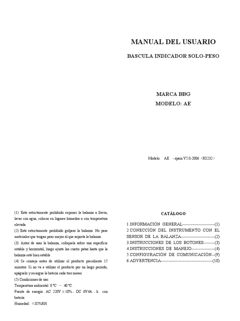 (1) Está estrictamente prohibido exponer la balanza a lluvia, CATÁLOGO