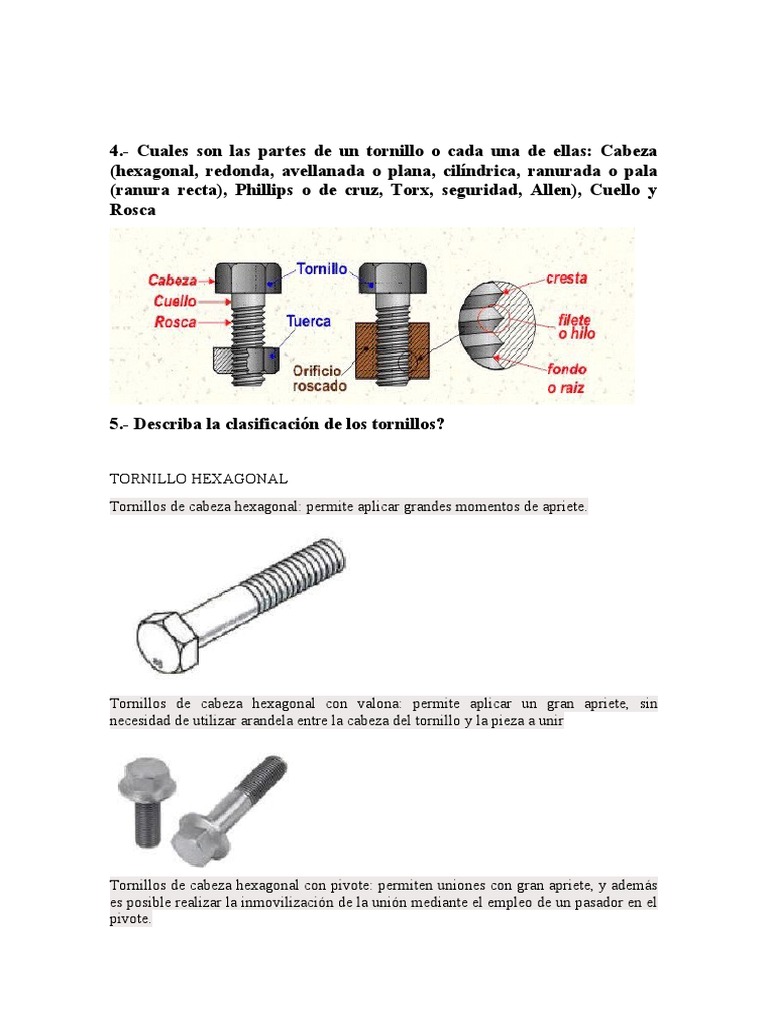 - Cuales son las partes de un tornillo o cada una de ellas: Cabeza