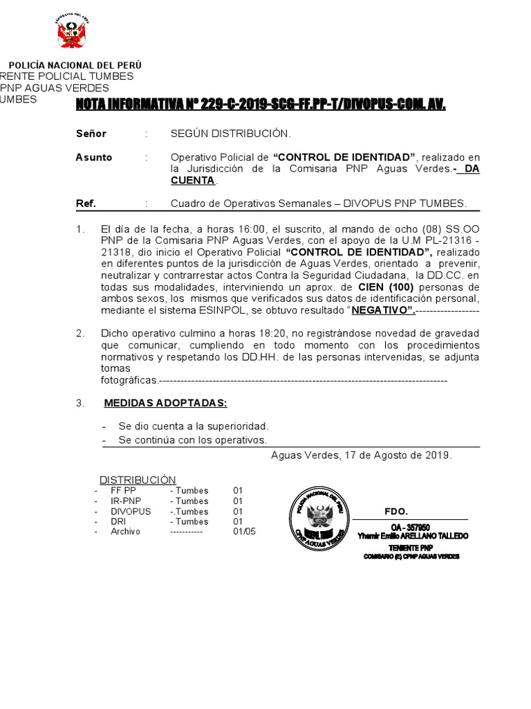 NOTA INFORMATIVA Nº 229-C-2019-SCG-FF.PP-T/DIVOPUS-COM. AV.