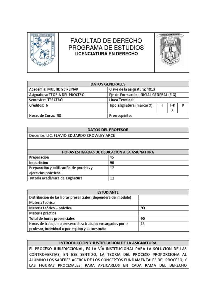 Asignatura: TEORIA DEL PROCESO Eje de Formación: INICIAL GENERAL (FIG)