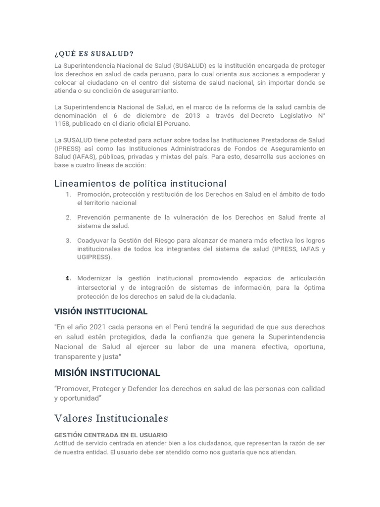 La Superintendencia Nacional de Salud (SUSALUD) es la institución encargada de proteger