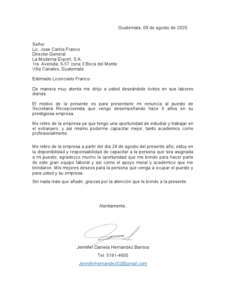 El motivo de la presente es para presentarle mi renuncia al puesto de