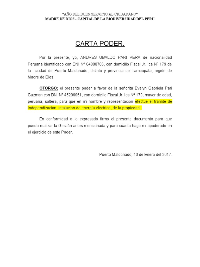 MADRE DE DIOS, POR LO QUE OTORGO A MI APODERADA TODAS LA FACULTADES PARA PODER