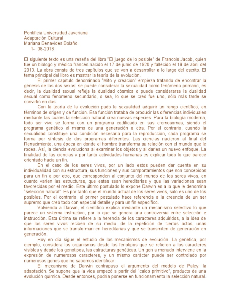 El siguiente texto es una reseña del libro “El juego de lo posible” de Francois Jacob, quien