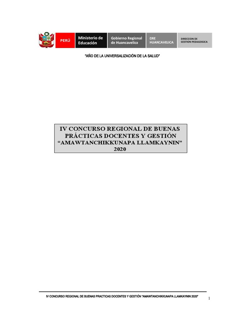 IV CONCURSO REGIONAL DE BUENAS PRACTICAS DOCENTES Y GESTIÓN “AMAWTANCHIKKUNAPA LLAMKAYNIN 2020”