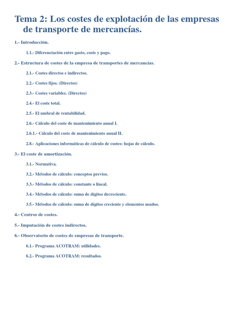 uno de los costes: características técnicas y de explotación, costes fijos, costes variables, costes indirectos y resultados.