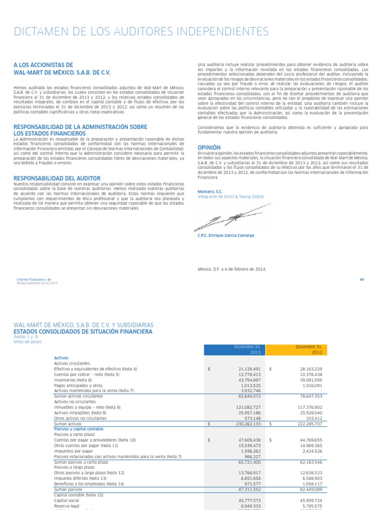 Hemos auditado los estados financieros consolidados adjuntos de Wal-Mart de México, considera el control interno relevante para la preparación y presentación razonable de los