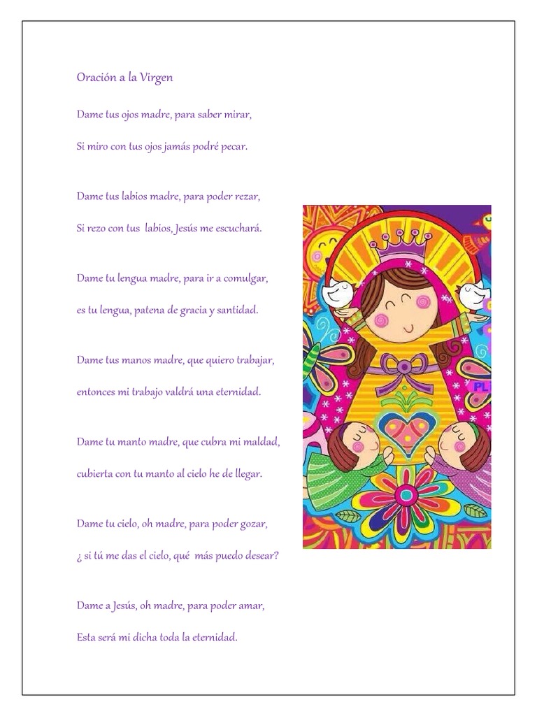 Este poema es una oración a la Virgen María en la que el autor le pide prestados sus atributos para poder acercarse más a Dios y alcanzar el cielo. A través de siete estrofas, el autor le solicita a la Virgen sus ojos, labios, lengua, manos y manto para poder mirar sin pecar, rezar y comulgar correctamente, trabajar con propósito, cubrir su maldad y finalmente alcanzar el cielo y amar a Jesús para toda la eternidad.