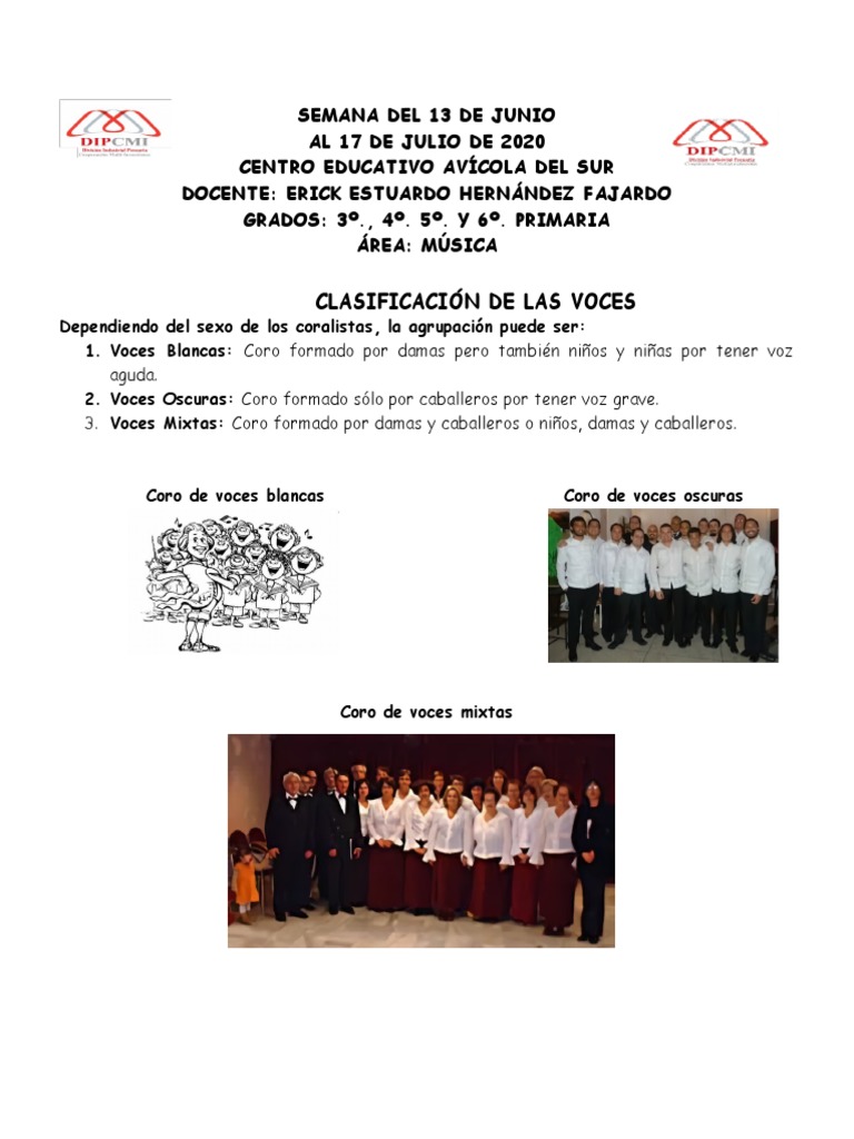Coro de Voces Mixtas y un Coro de Voces Adultas. Enviar fotografías de lo trabajado al Whatsapp