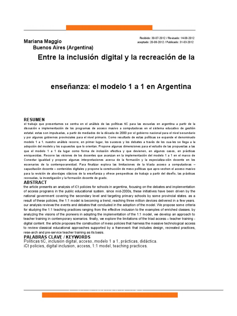 Políticas tiC, inclusión digital, acceso, modelo 1 a 1, prácticas, didáctica.