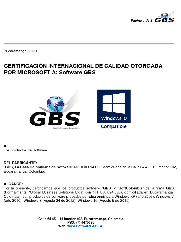 Por la presente, certificamos que los productos software “GBS” y “SoftColombia” de la firma GBS