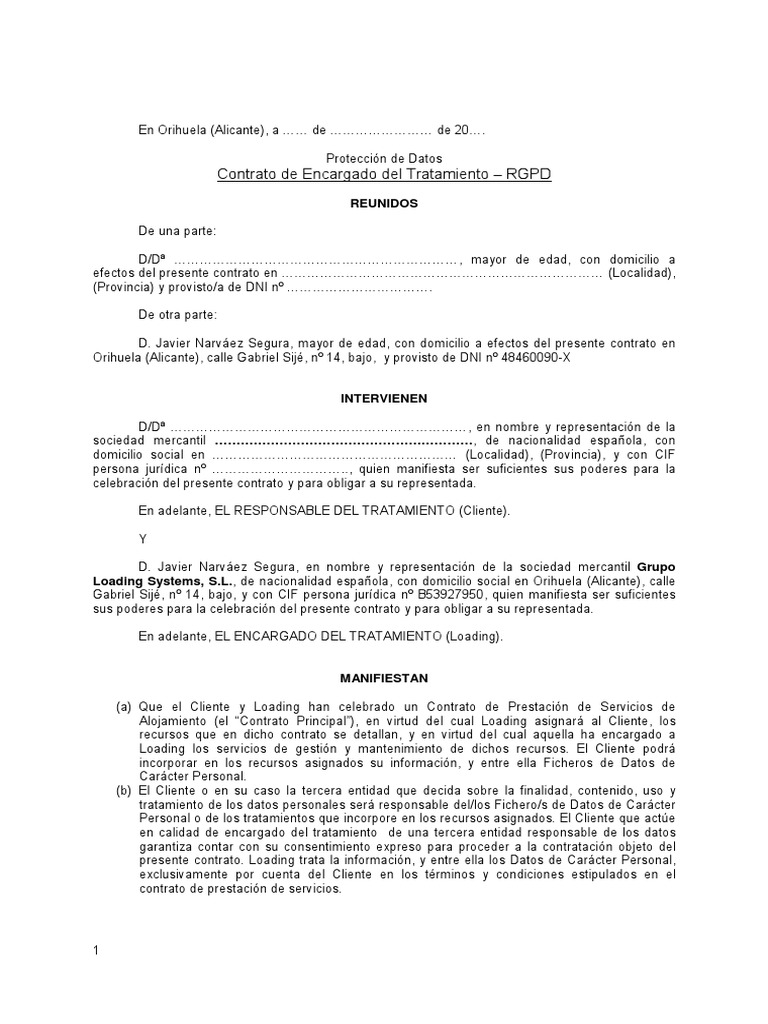 presente contrato. Loading trata la información, y entre ella los Datos de Carácter Personal,