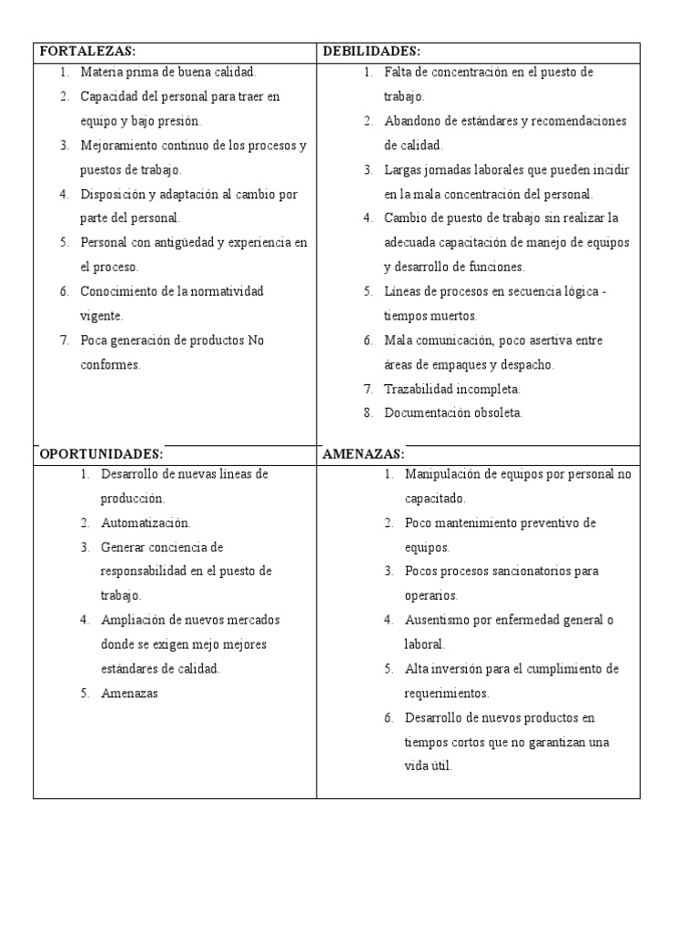 1. Materia prima de buena calidad. 1. Falta de concentración en el puesto de