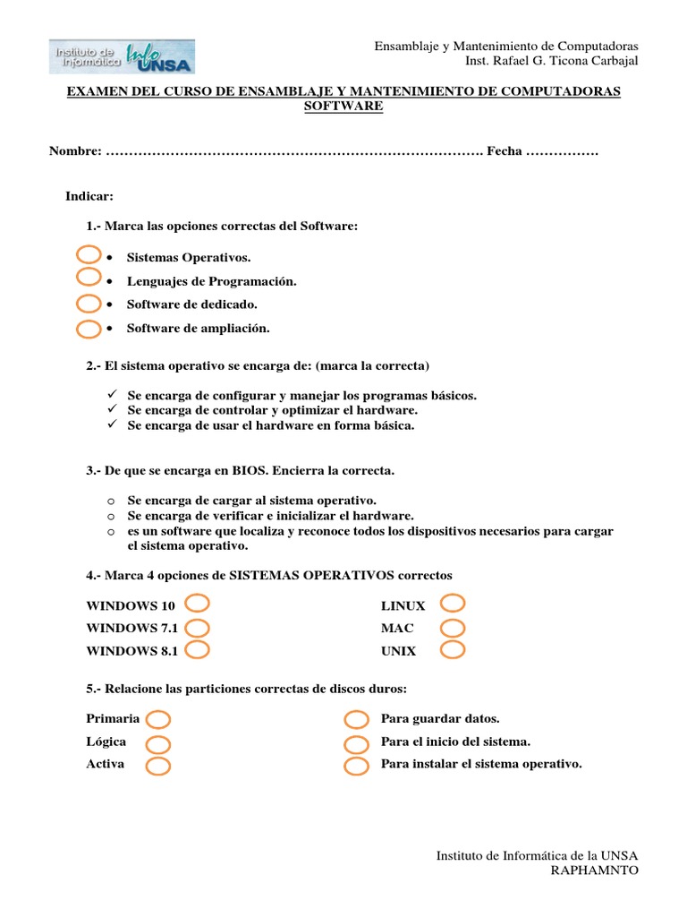 EXAMEN DEL CURSO DE ENSAMBLAJE Y MANTENIMIENTO DE COMPUTADORAS
