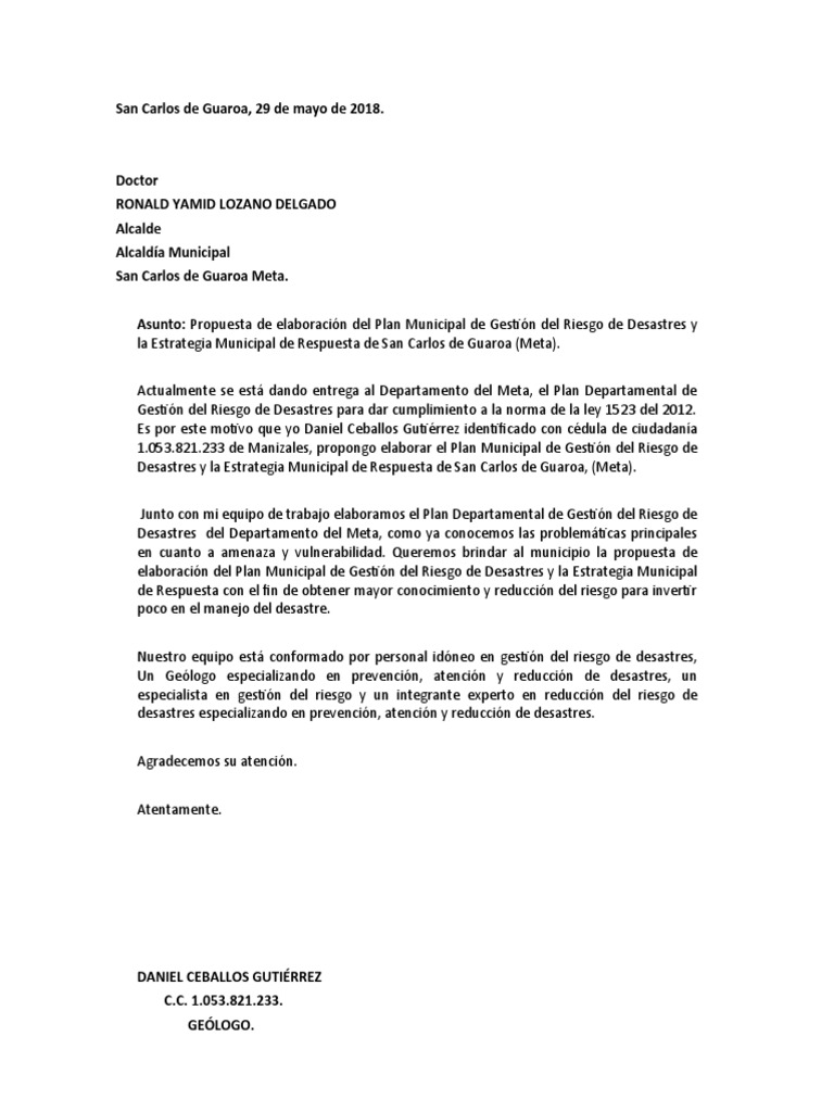 Asunto: Propuesta de elaboración del Plan Municipal de Gestión del Riesgo de Desastres y