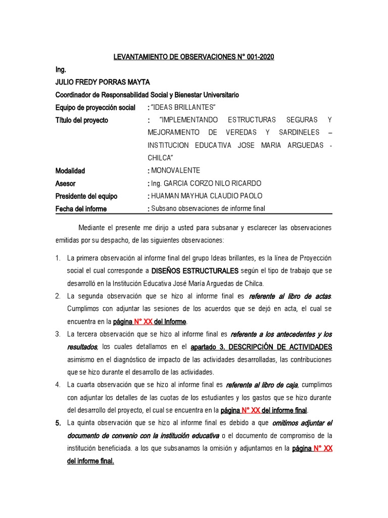 LEVANTAMIENTO DE OBSERVACIONES N° 001-2020
