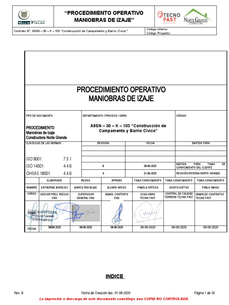 establecidas para este procedimiento “Maniobras de Izaje”, asignado recursos