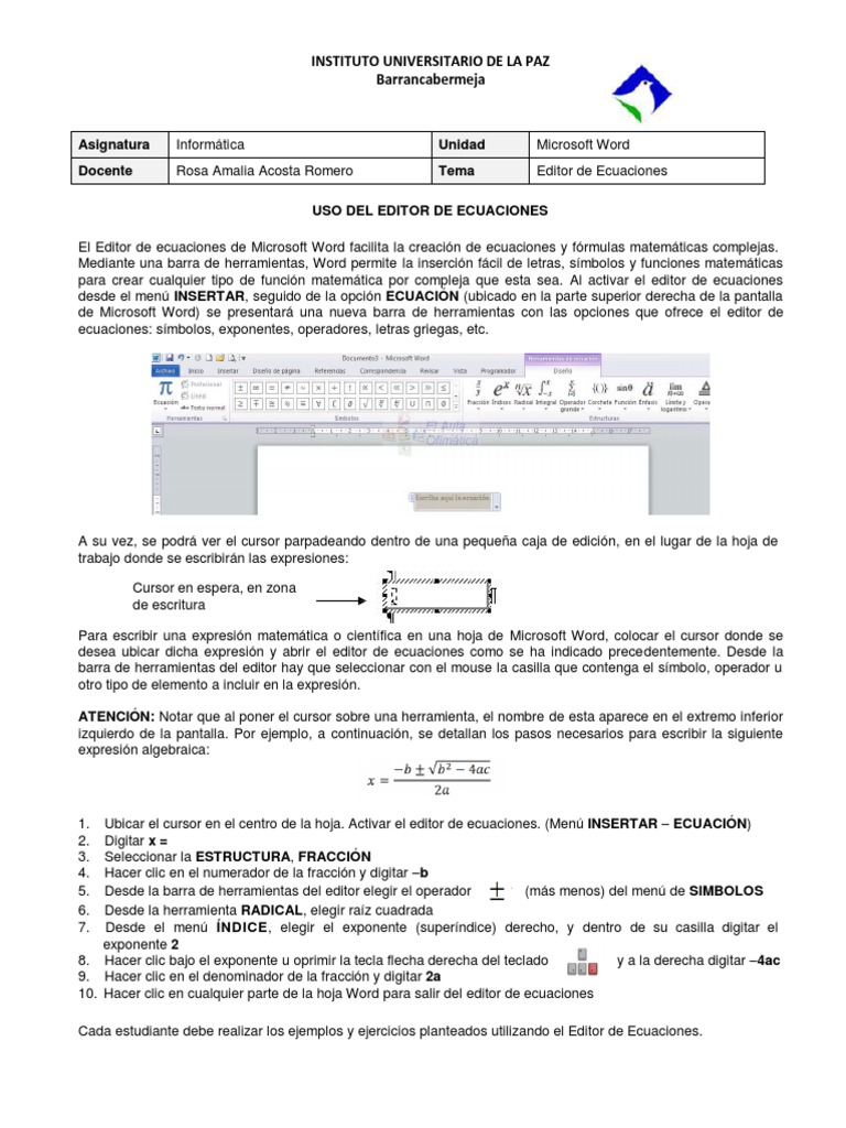Docente Rosa Amalia Acosta Romero Tema Editor de Ecuaciones