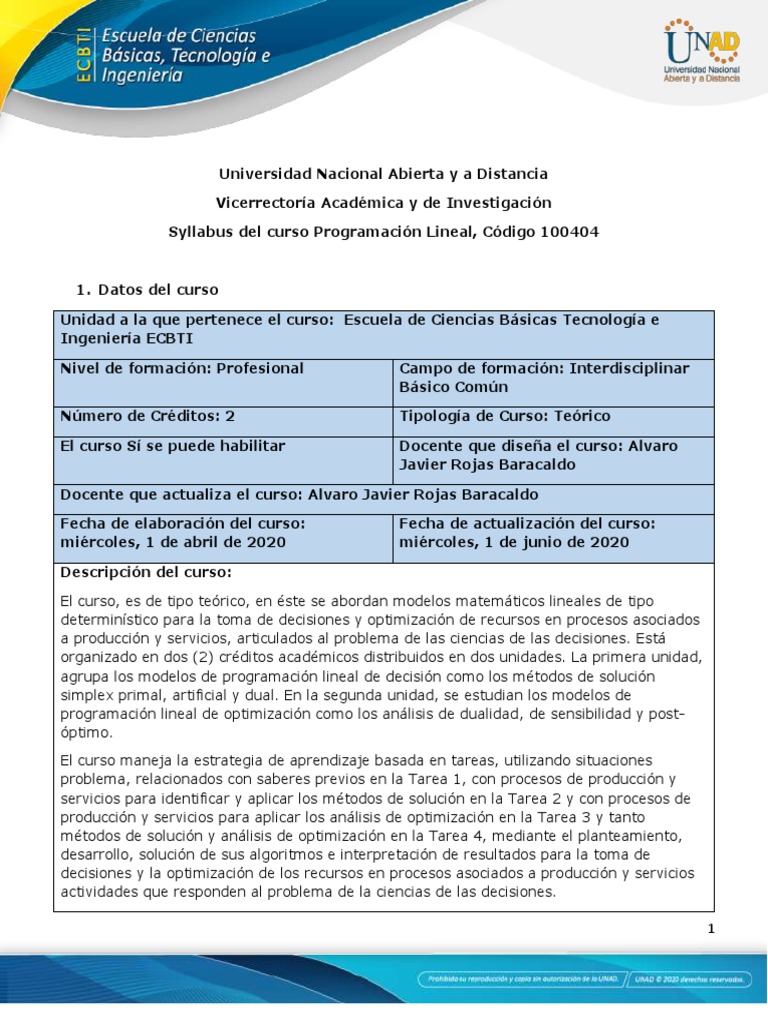 Unidad a la que pertenece el curso: Escuela de Ciencias Básicas Tecnología e
