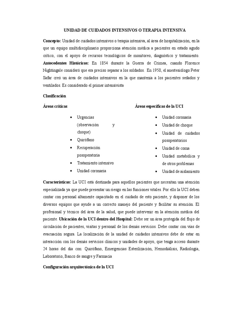 Concepto: Unidad de cuidados intensivos o terapia intensiva, al área de hospitalización, en la