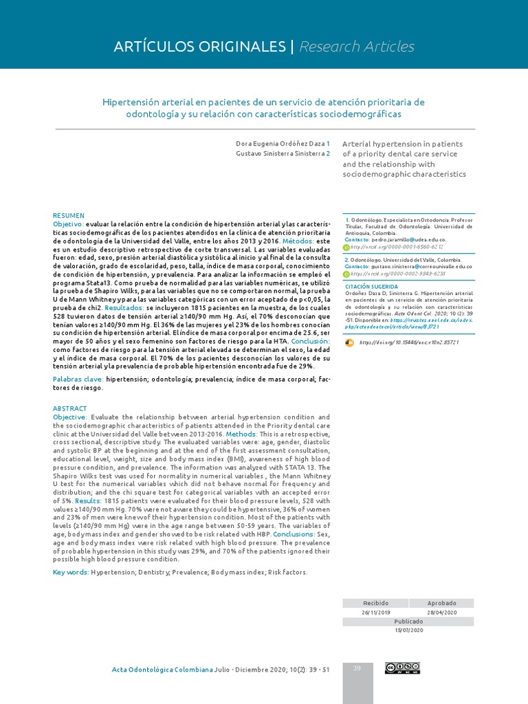 Palabras clave: hipertensión; odontología; prevalencia; índice de masa corporal; fac-