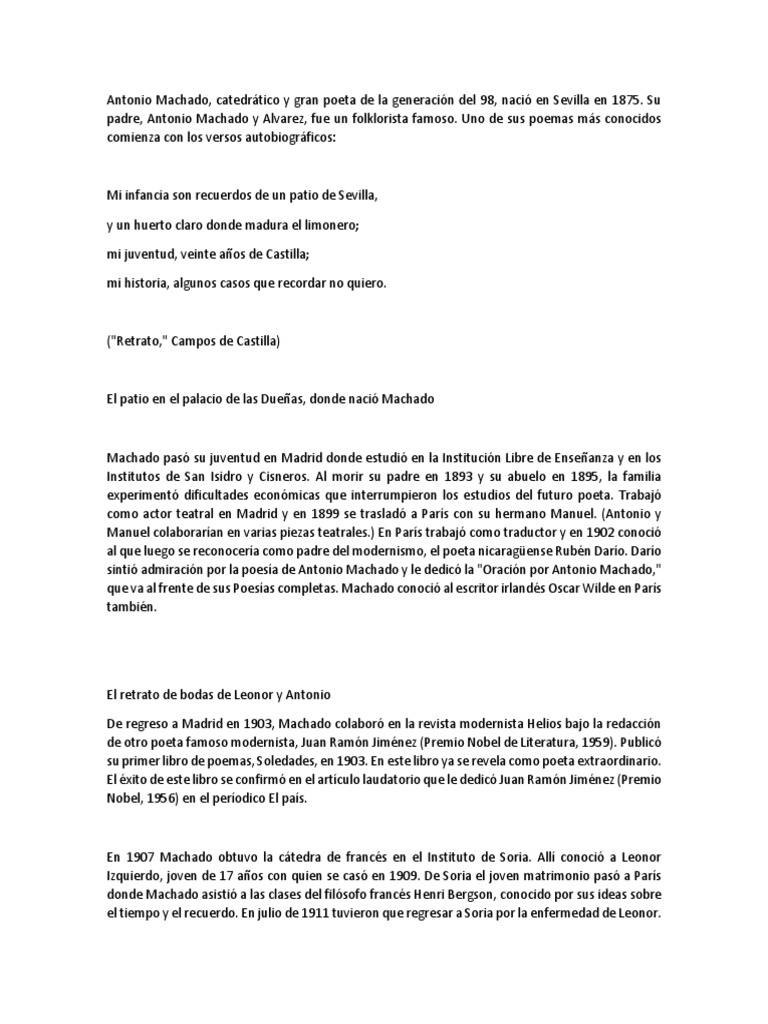 padre, Antonio Machado y Alvarez, fue un folklorista famoso. Uno de sus poemas más conocidos