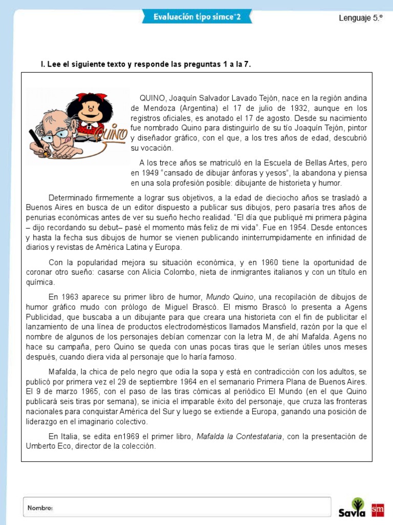 I. Lee el siguiente texto y responde las preguntas 1 a la 7.