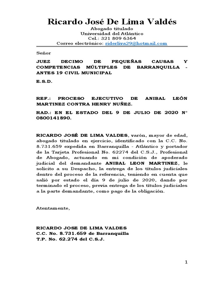 solicito a su Despacho, la entrega de los títulos judiciales