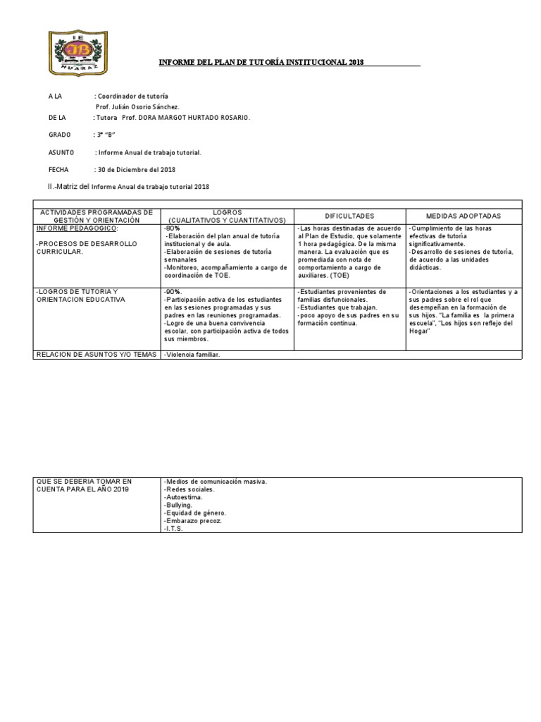 INFORME DEL PLAN DE TUTORÍA INSTITUCIONAL 2018