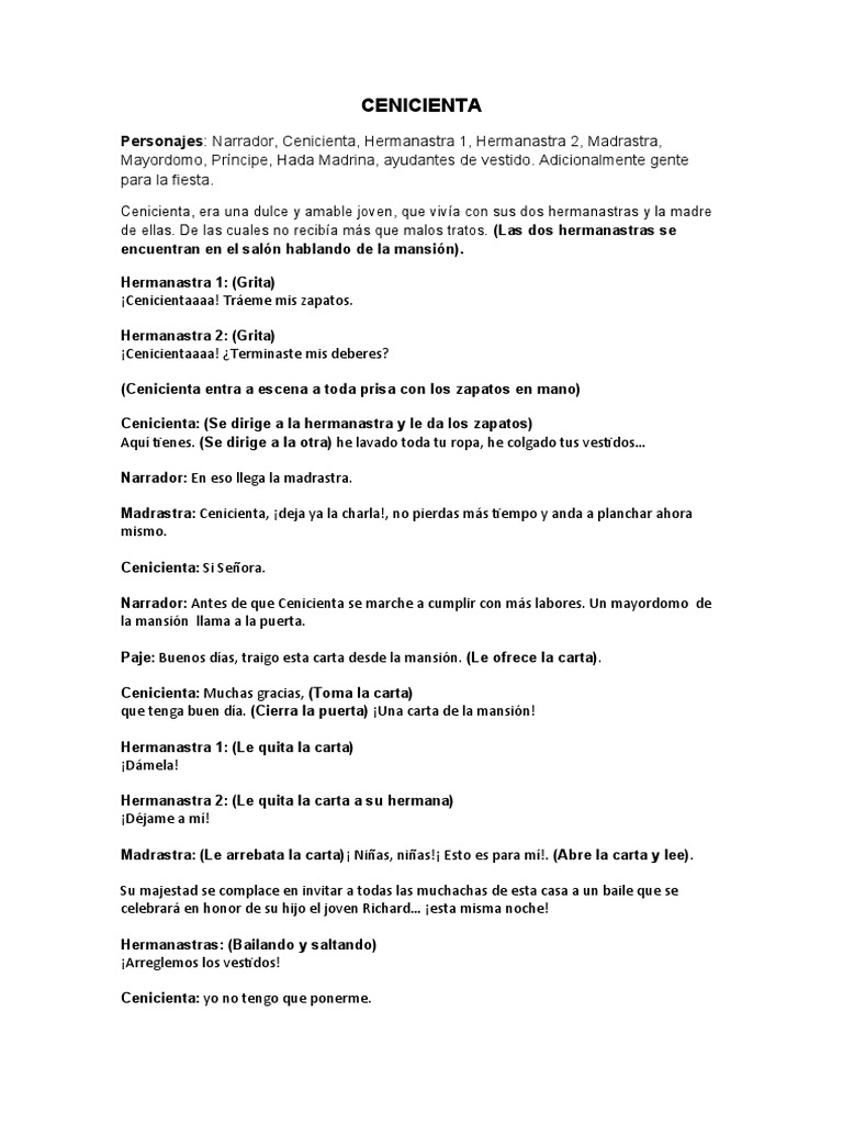 Personajes: Narrador, Cenicienta, Hermanastra 1, Hermanastra 2, Madrastra,