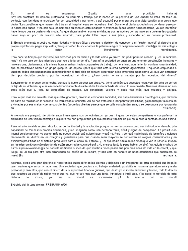 Además, existe una gran diferencia: nosotras las putas abrimos las piernas y dejamos a un integrante de esta sociedad que haga lo