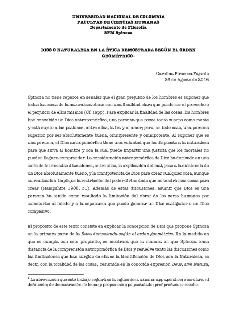 en la primera parte de la Ética demostrada según el orden geométrico. En la medida en