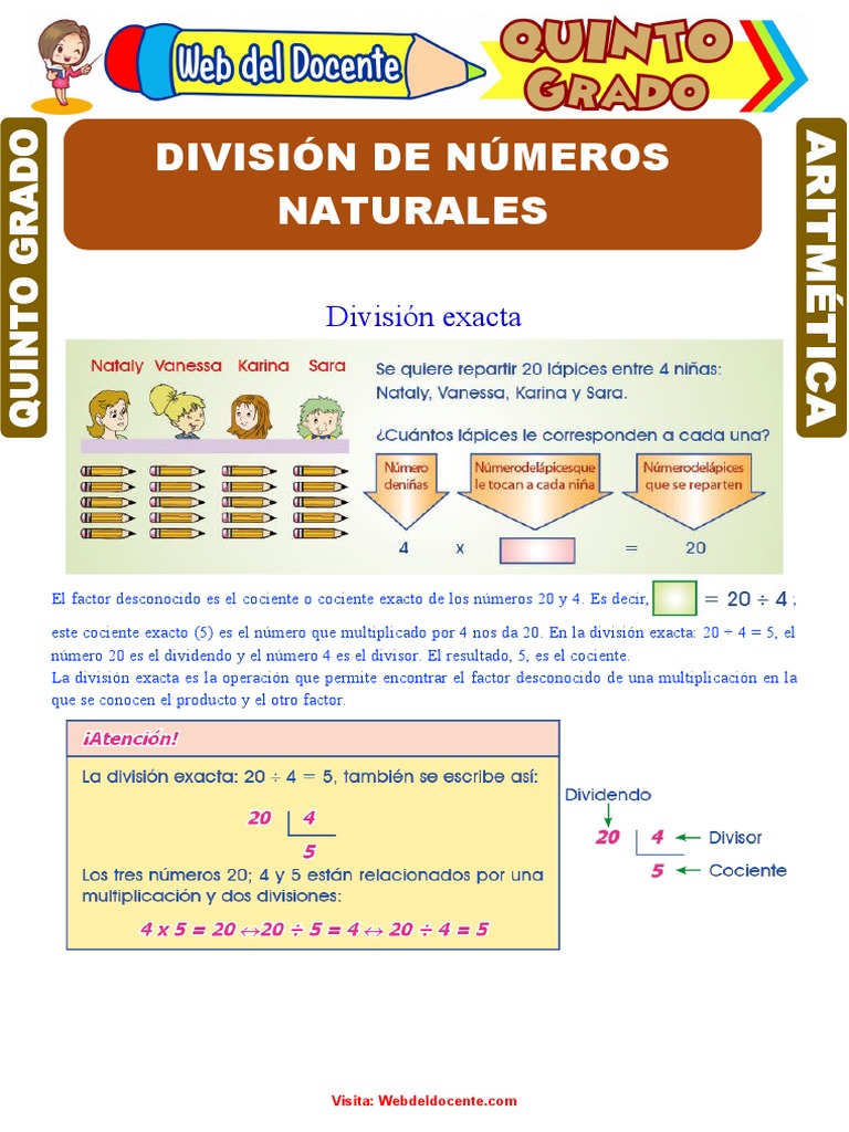 este cociente exacto (5) es el número que multiplicado por 4 nos da 20. En la división exacta: 20 ÷ 4 = 5, el