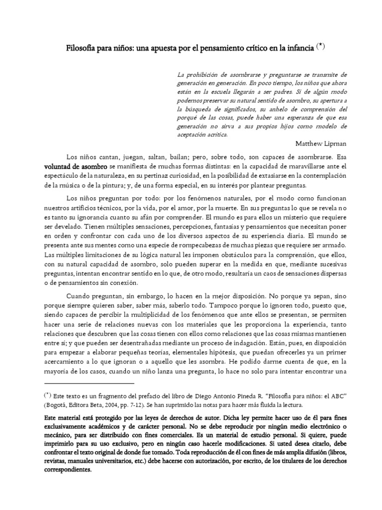 Filosofía para Niños Una Apuesta Por El Pensamiento Crítico en La Infancia PDF