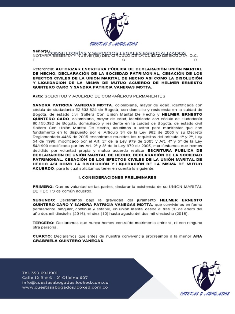 Acto: SOLICITUD Y ACUERDO DE COMPAÑEROS PERMANENTES