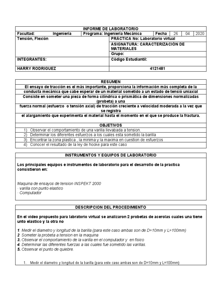 Tensión, Flexión PRÁCTICA No: Laboratorio virtual