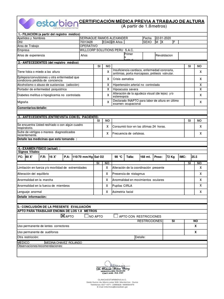 CERTIFICACIÓN MÉDICA PREVIA A TRABAJO DE ALTURA