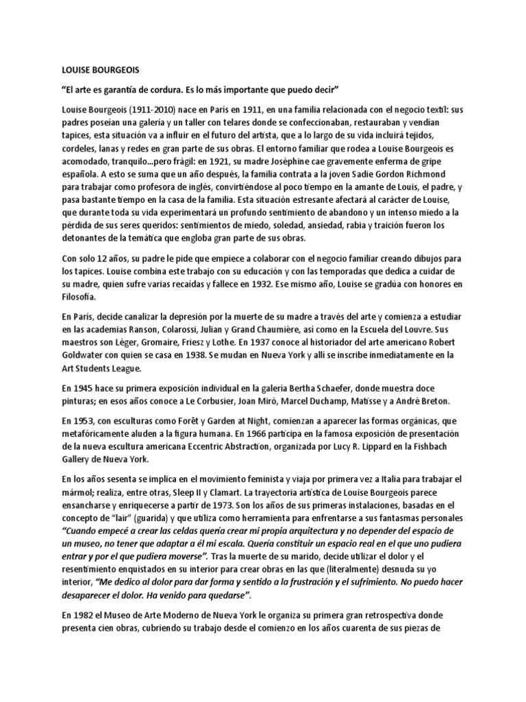 Louise Bourgeois (1911-2010) nace en París en 1911, en una familia relacionada con el negocio textil: sus